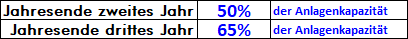 Für das zweite und dritte Jahr kannst du mit folgender Zugangsverteilung kalkulieren. Als Ziel solltest du dir zum Ende des zweiten Jahres 50% und zum Ende des dritten Jahres 65% der Anlagenkapazität setzen.
